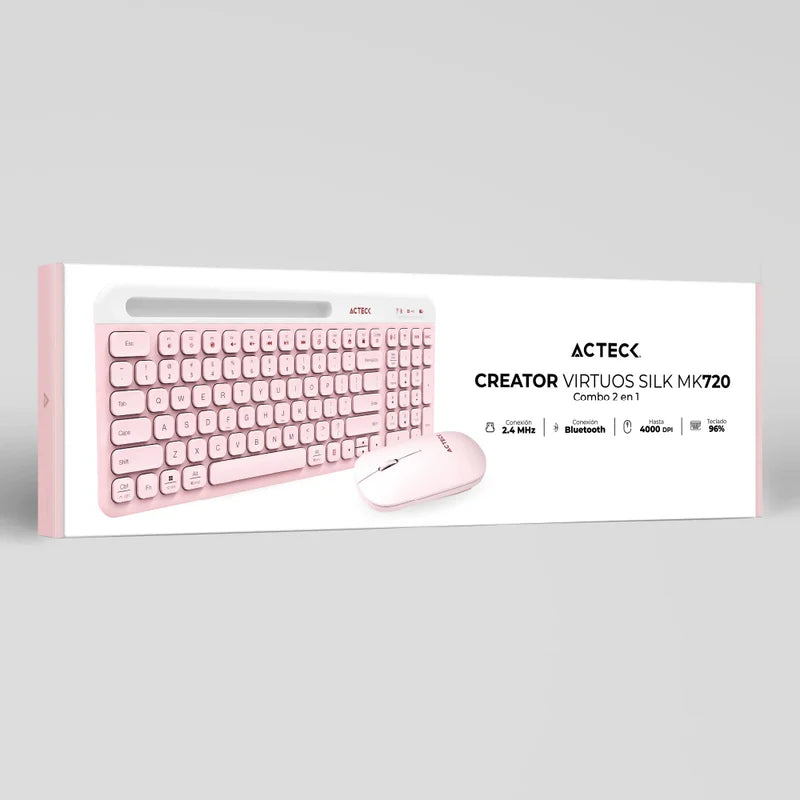 Kit Acteck Creator Virtuos Silk Mk720 / Teclado Y Mouse / Inalambrico / Dual Bt Usb / Recargable / EspaÑol / 100 Teclas / Multimedia / Ranura P /dispositivos / 4000 Dpi / Optico / Rosa / Ac-936279