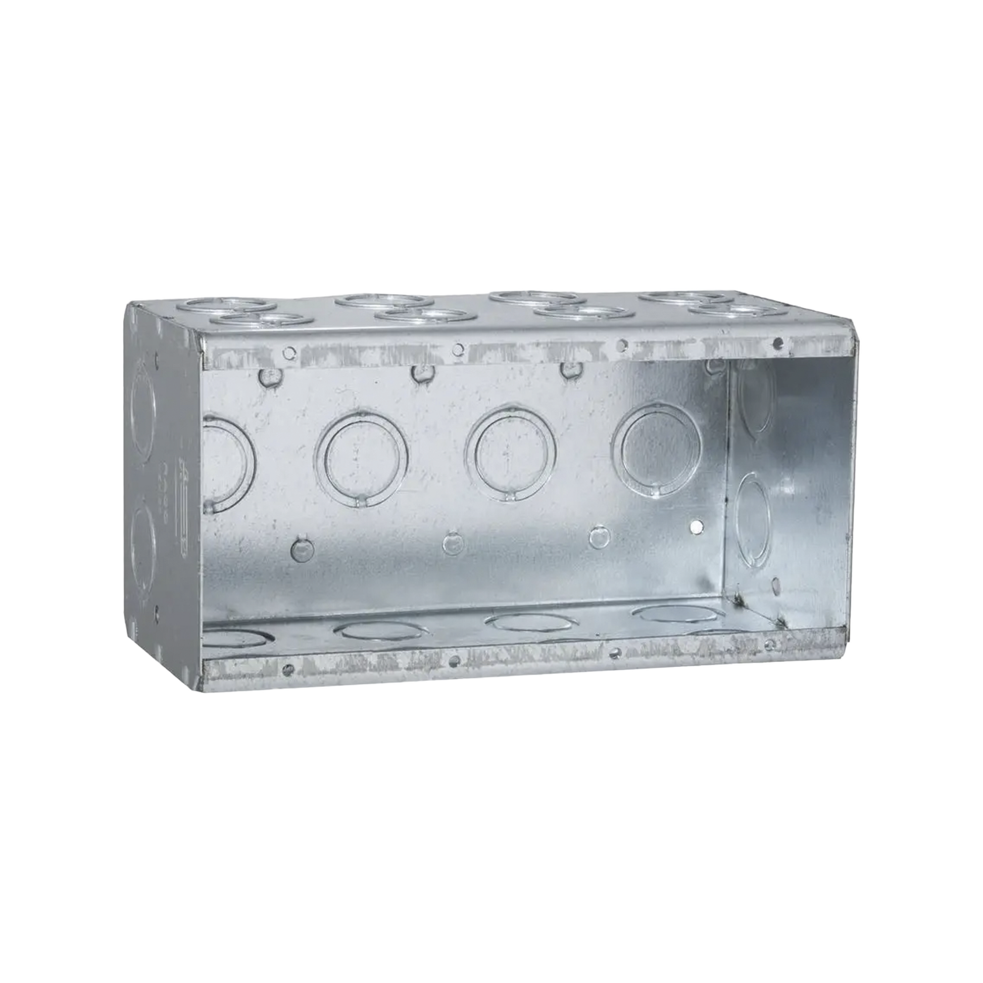 Cajas multigang de acero galvanizado de 3 1/2" de profundidad cuentan con entradas para tubería de 1/2" y 3/4".