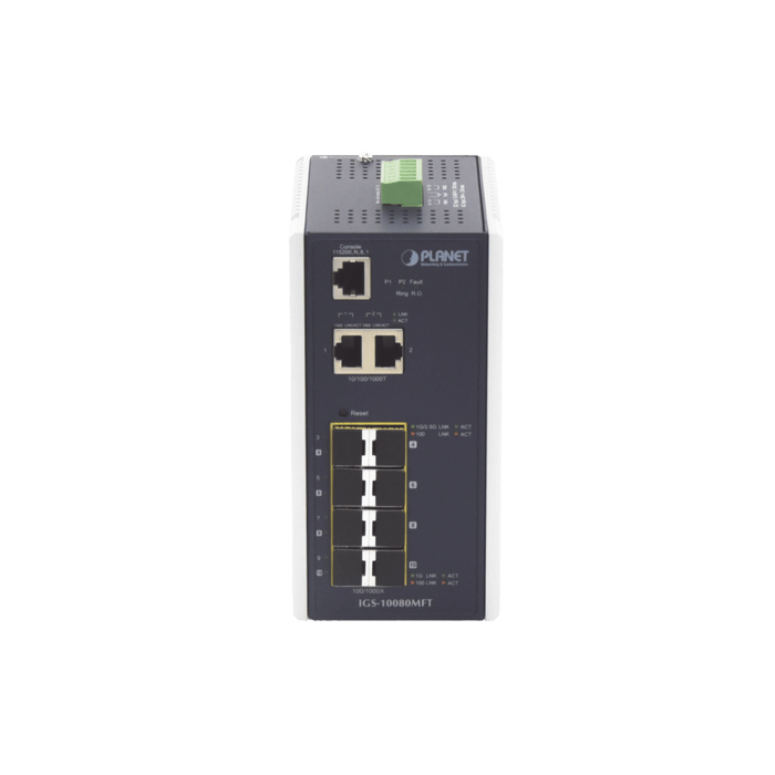 PLANET IGS-10080MFT es un conmutador Ethernet gestionable de Gigabit completo de 10 puertos industrial especialmente diseñado para construir una red troncal Gigabit completa para transmitir datos confiables de alta velocidad en entornos exigentes de la industria pesada y también puede reenviar datos a una red remota a través de fibra óptica. Proporciona dos puertos de fibra óptica SFP 100/1000 / 2500BASE-X y seis 100 / 1000BASE-X SFP , dos interfaces de cobre 10/100 / 1000BASE-T adicionales entregadas en una carcasa resistente IP30 con sistema de alimentación redundante. Al poder funcionar en un rango de temperatura de -40 a 75 grados C , el IGS-10080MFT se puede colocar en casi cualquier entorno hostil.