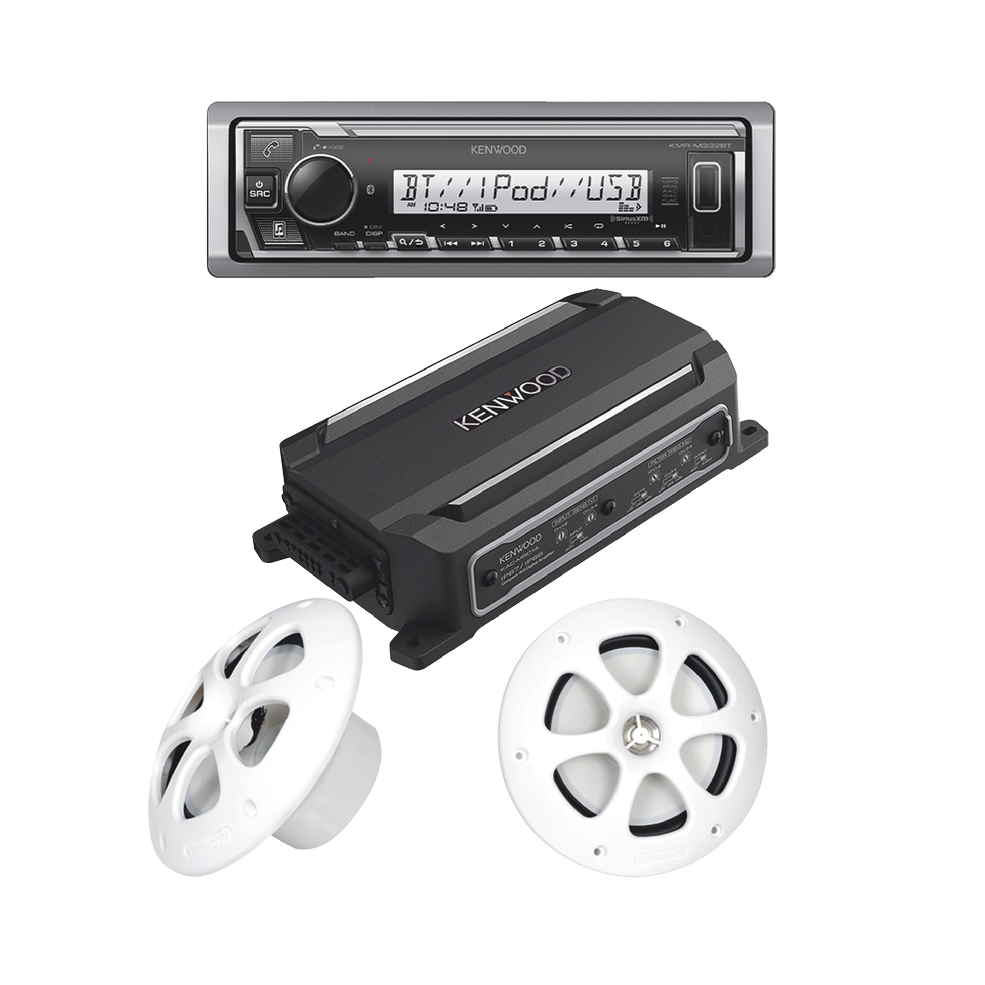 Kit de estereo con Bluetooth KMR-M332BT | Amplificador KAC-M5014 | mas Par de bocinas KFC-1613MRW