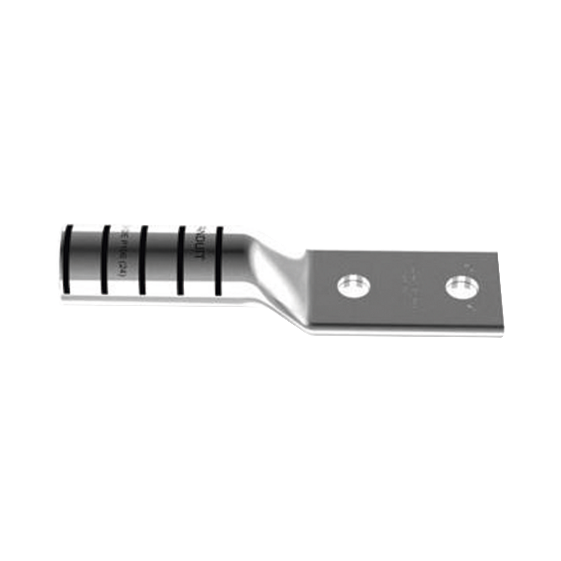 El conector Copper Lug - Two-Hole, Long Barrel está diseñado para aplicaciones eléctricas de hasta 35 kV, fabricado con tubo de cobre sin costura de alta conductividad y recubrimiento de electro-estaño. Certificado por UL y C.S.A, es apto para su uso con cables de cobre trenzado, presentando un código de color Panduit negro en el barril.