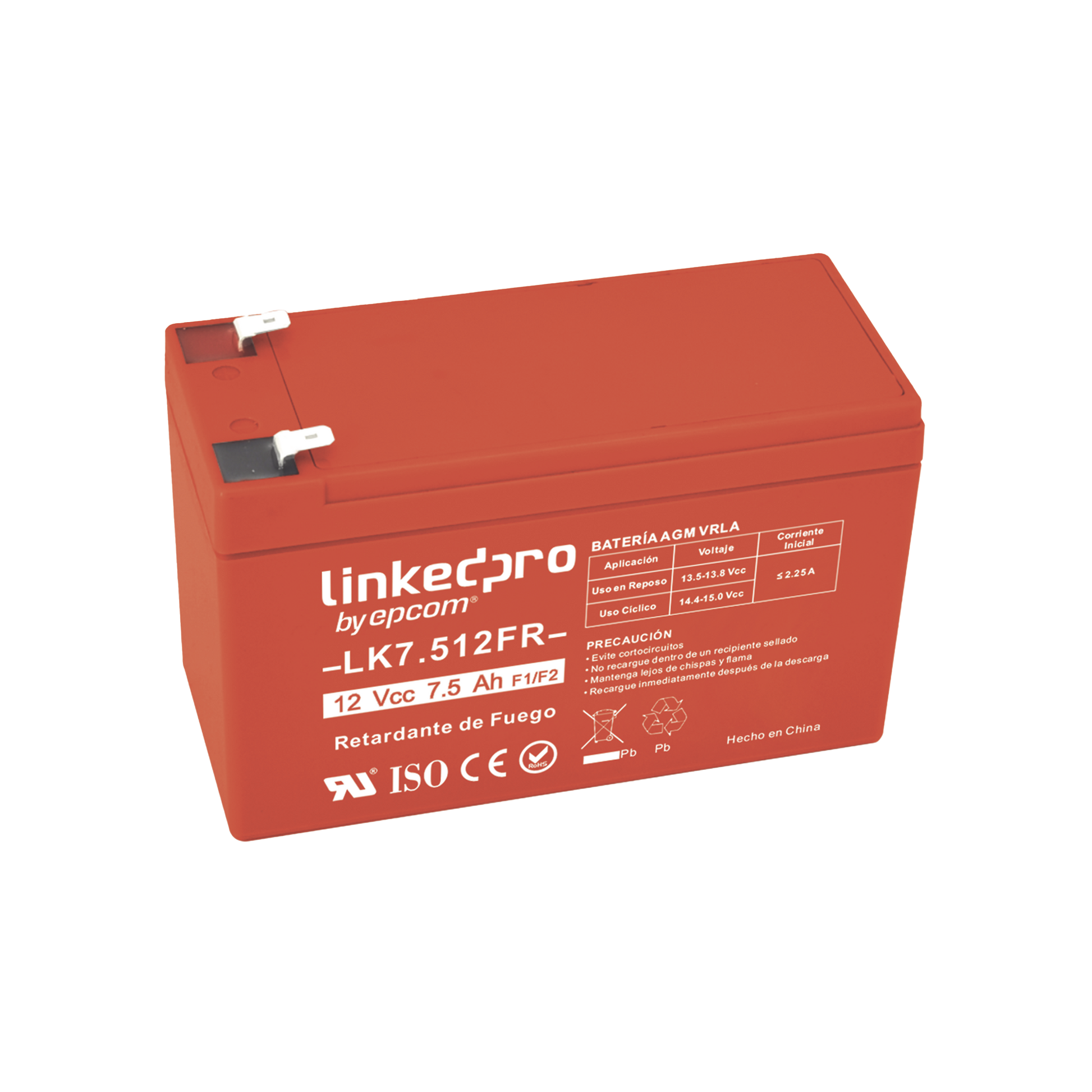 Batería 12 Vcc / 7.5 Ah / UL / Tecnología AGM-VRLA / Retardante a la Flama / Para uso en equipo electrónico, Alarmas de Intrusión / Incendio/ Control de acceso / Video Vigilancia / Terminales F1 ( Incluye adaptador para termina