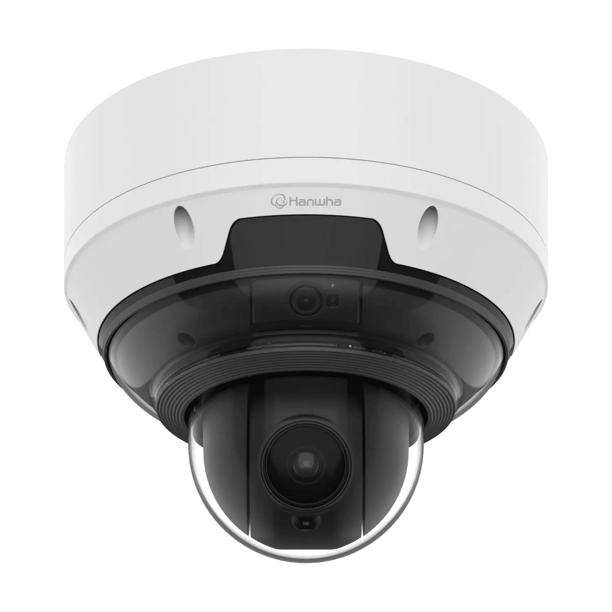 La cámara AI PNM-C19183RVTP de Hanwha Vision combina una cámara fija de 5MP con 3 canales y una cámara PTZ de 4MP con zoom óptico de 18x en un diseño compacto y todo en uno. Equipada con un motor de inteligencia artificial avanzado, ofrece detección de objetos (personas, vehículos, matrículas), análisis de video inteligente (IVA) y funciones de inteligencia empresarial como conteo de personas y vehículos. Con certificación IP66, iluminación IR de hasta 15 metros y soporte para PoE++, es ideal para aplicaciones de seguridad exigentes en exteriores.