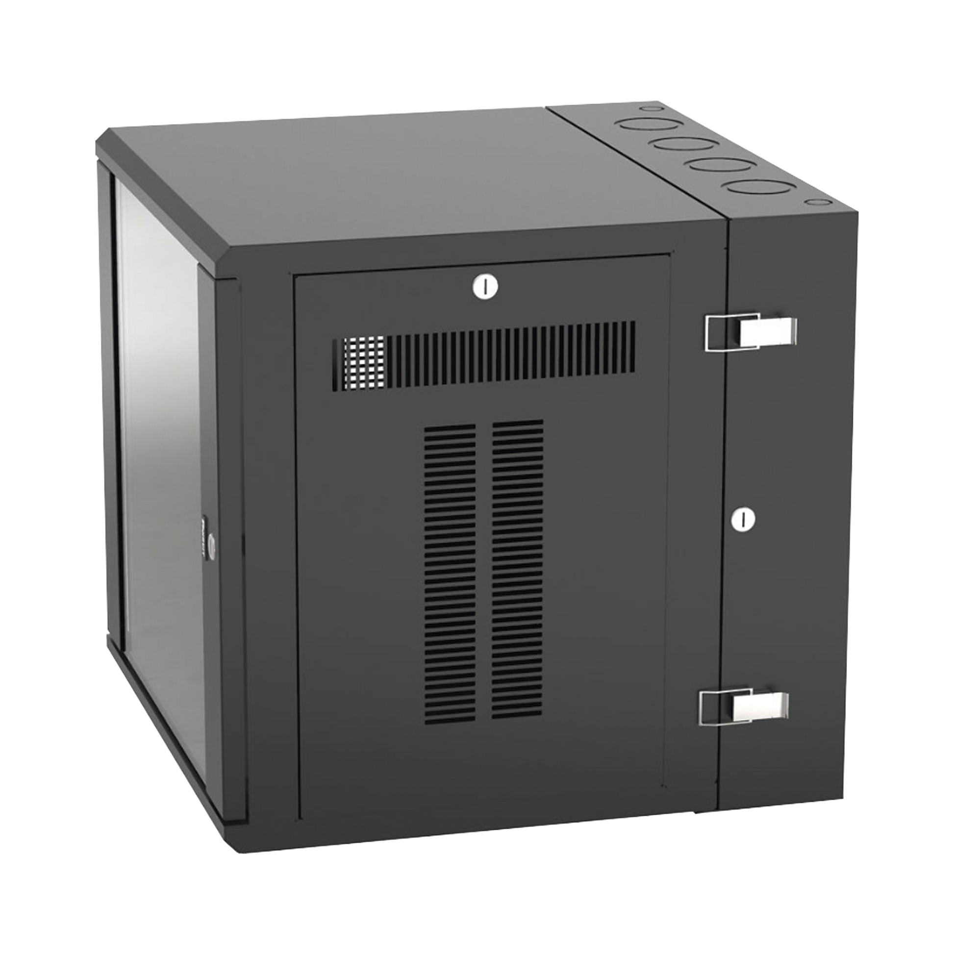 Gabinete de montaje en pared construido en acero, soporta 12 unidades de Rack para equipos de red activos o pasivos. Cuenta con paneles laterales totalmente desmontables y esta diseñado para permitir el control de clima adecuado para uso con diversos equipos de red, así como Switches de alimentación remota (PoE) y fuentes de alimentación ininterrumpida (UPS).