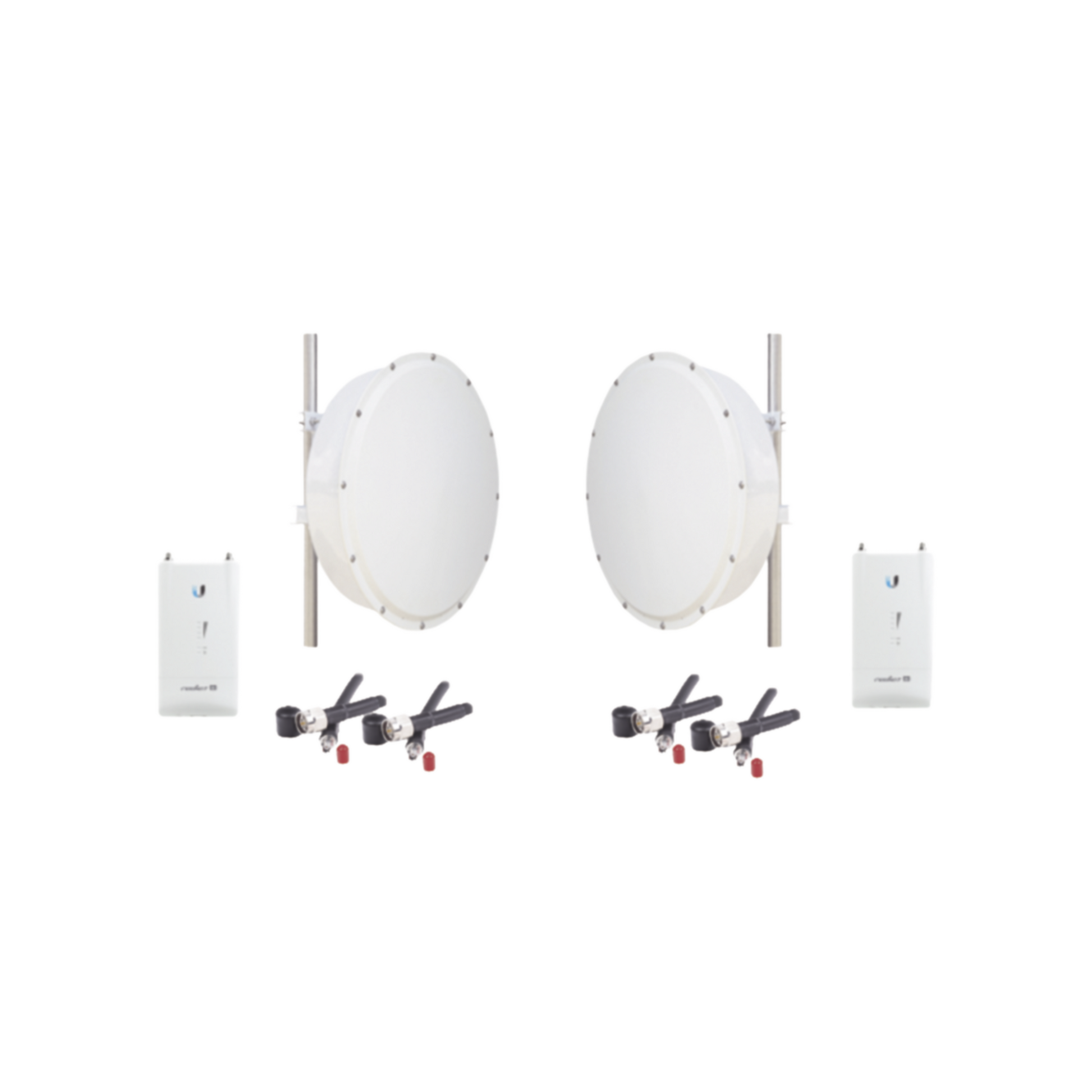 Kit de 2 radios R5ACLITE, 2 antenas de 30 dBi con rango de frecuencias (4.9-6.5 GHz), incluye jumpers y radomo, ideal para distancias de hasta 30km