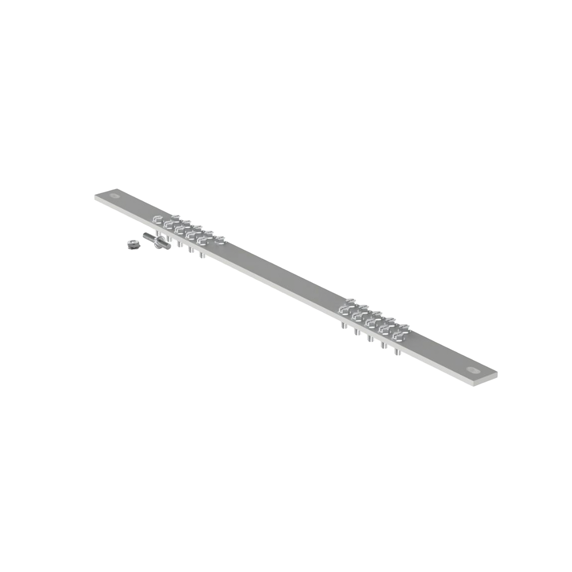 Barra colectora de conexión a tierra, longitud de 19 "(483 mm), estañada, veinte orificios para flexibilidad en el montaje, con veinte tornillos de cabeza hexagonal # 12-24 x 1/2" instalados, los juegos de orificios de montaje tienen un espaciado de 5/8 "(15.9 mm) , provisto de dos tornillos N ° 12-24.