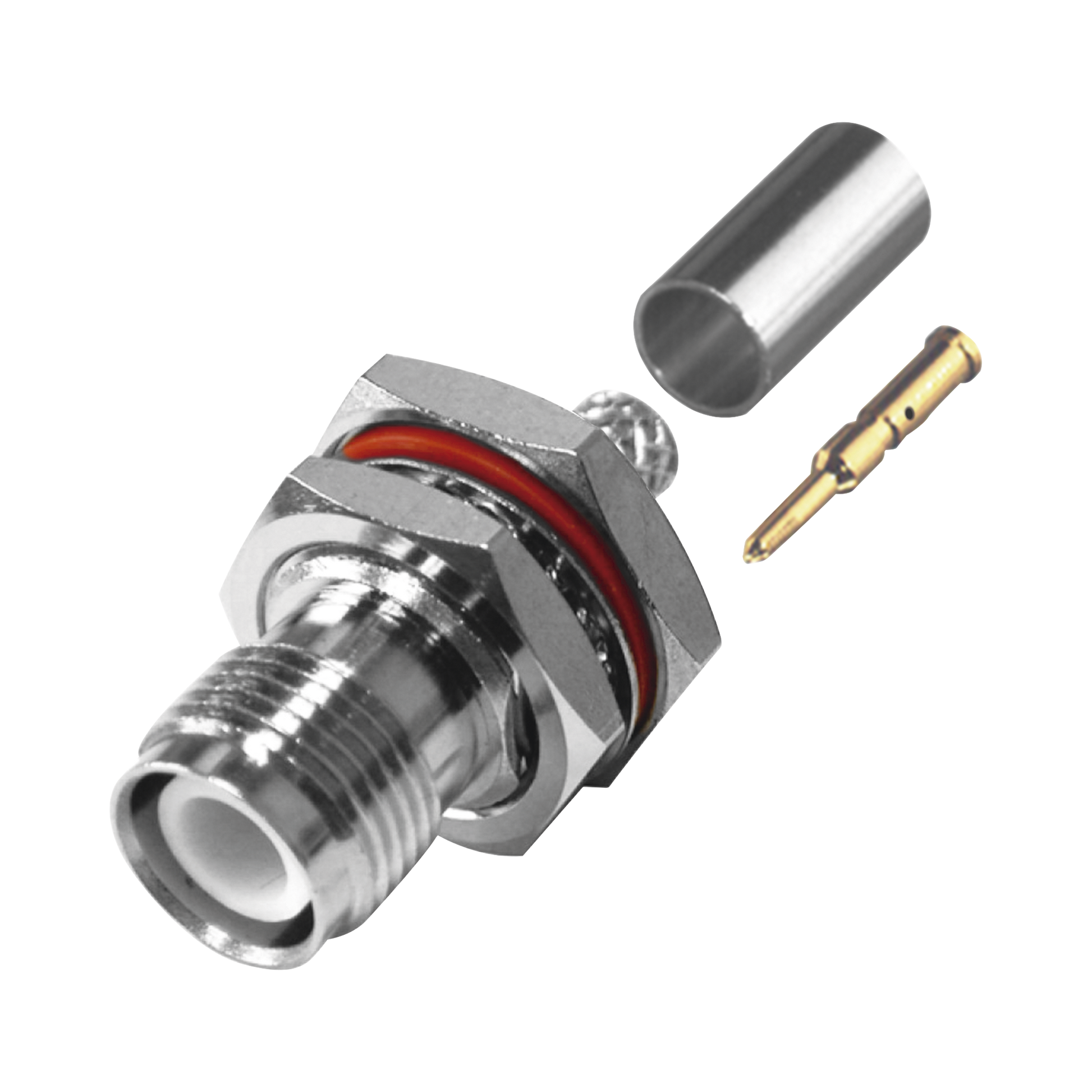 Conector TNC Hembra Inverso de Montaje Trasero en Panel, D-Plano, Hermético de Anillo Plegable para RG-142/U, Níquel/ Oro/ Teflón.