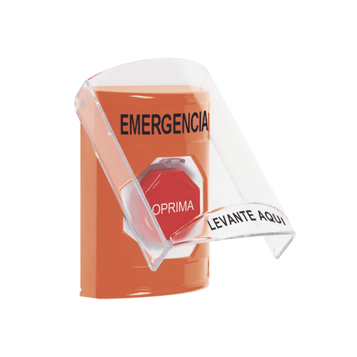 Botón Multipropósito, Color Naranja, De Superficie, Con Tapa De Policarbonato, Con Bocina Pre Alarma, Para Interior, Llave Para Restablecer, Texto De Emergencia, Español