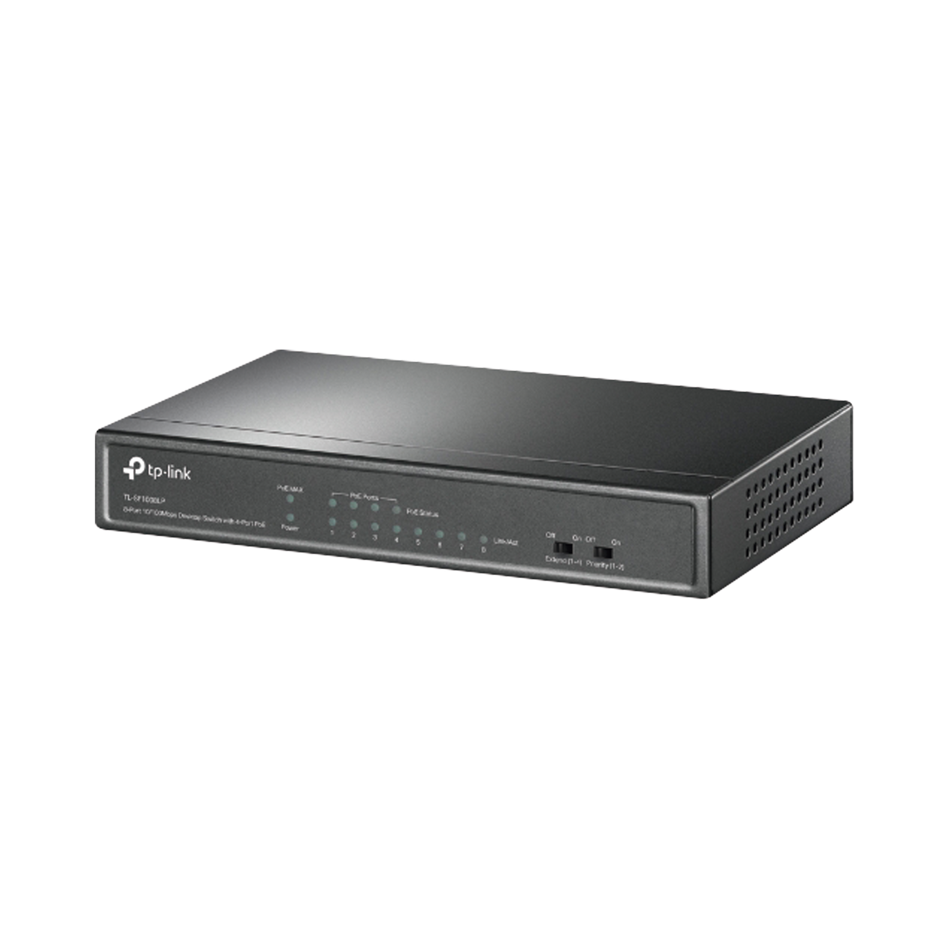 Switch PoE No Administrable de Escritorio / 8 puertos 10/100 Mbps / 4 puertos PoE af / Presupuesto 41 W / Modo extensor PoE hasta 250 metros / Calidad video prioritaria